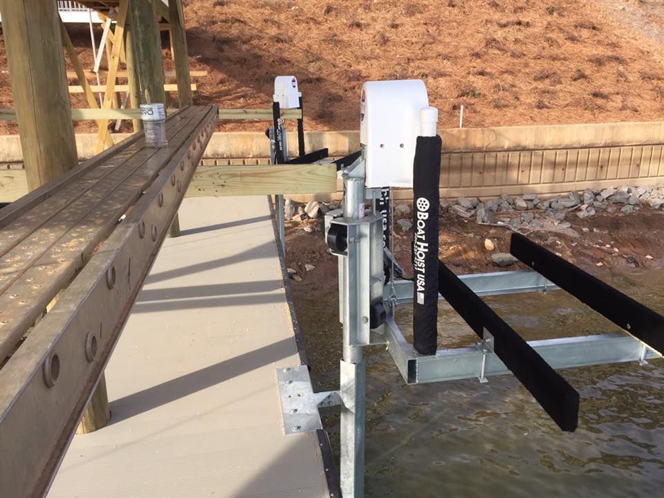 The BH-360 PWC Lift rotates when it is raised out of the water. Maintaining or storing personal watercraft is made easier with the 360-degree rotation. At least 18 inches of pipe should penetrate the clay bottom during installation. The PWC attaches to the top of the dock. Includes (2) 70-inch carpeted cradle bunks.